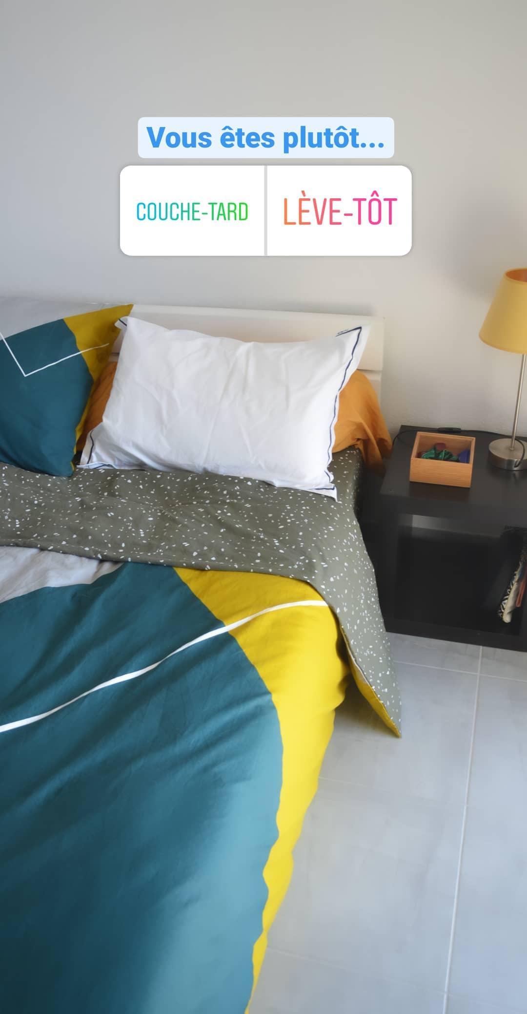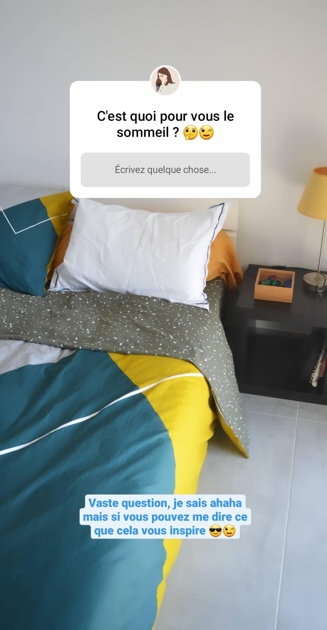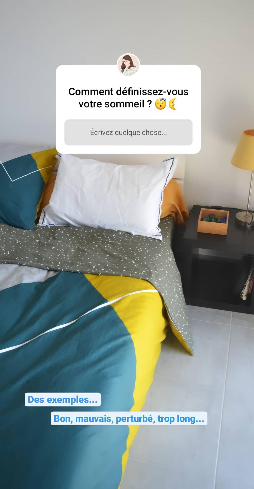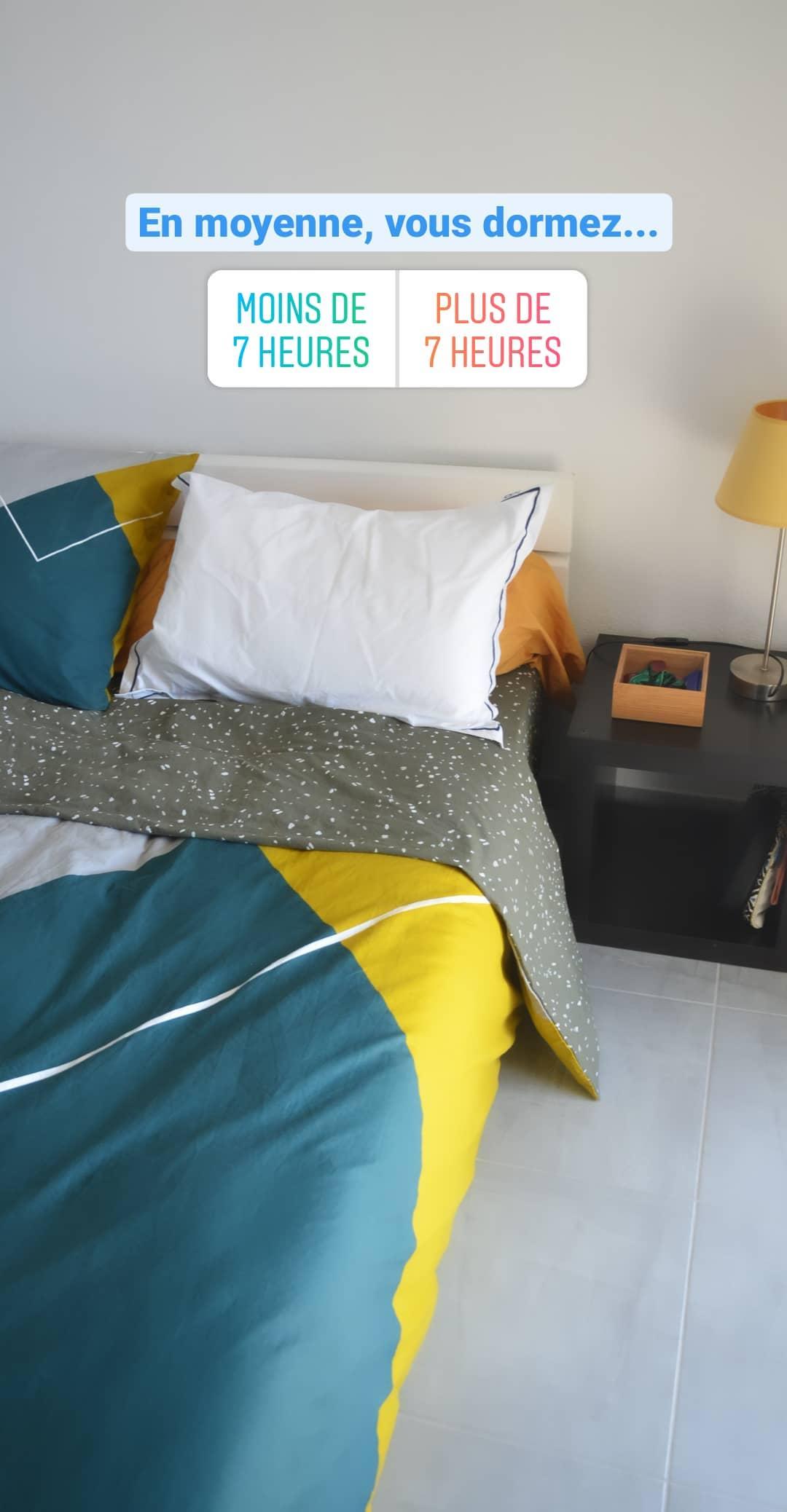 C’est bien de vous parler de mon sommeil mais pour faire ce sujet, je voulais aussi en savoir plus sur le vôtre. Alors, je vous ai sollicité sur les réseaux sociaux. Si vous me suivez sur mon compte Instagram @lemicrodecamille, vous avez peut-être participé à ma petite « enquête » en story. Au début du mois de novembre, je vous ai sondés et questionnés concernant votre sommeil. Comme pour toute étude, il est important de connaitre le nombre de participants. Vous êtes 120 à avoir répondu à mon questionnaire, un grand merci !! Cela me donne envie de renouveler l’opération sur un prochain sujet. 🙂