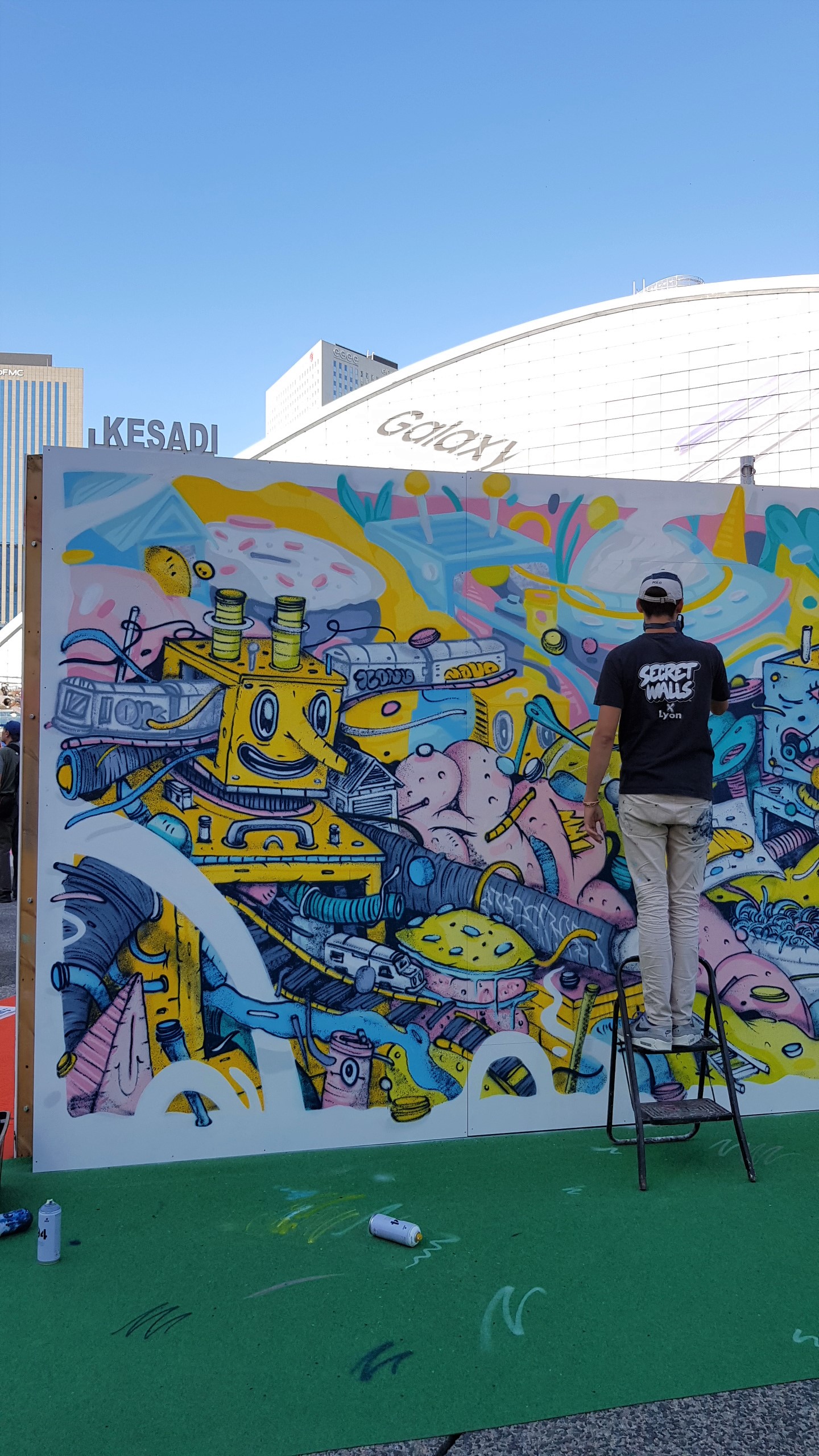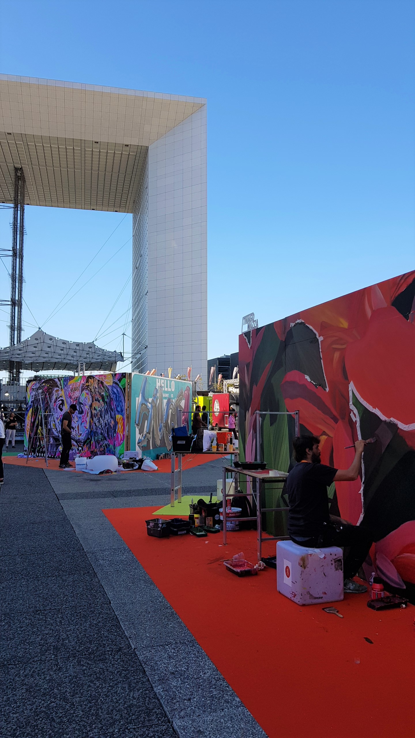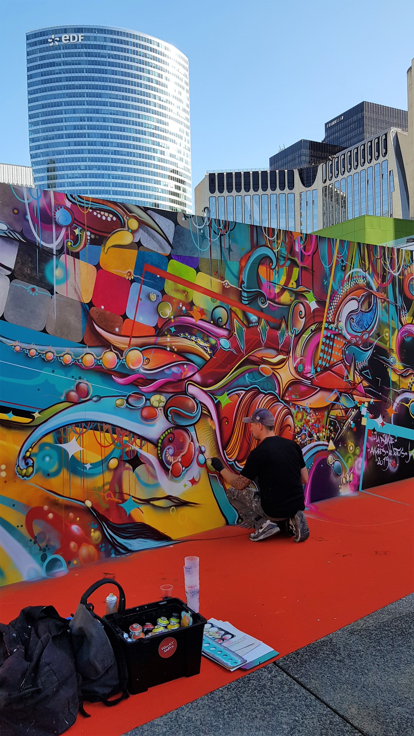 Je n’avais jamais vu des street-artistes travailler avant de me rendre sur le festival Urban Week. Le cadre est idéal sur le parvis de La Défense (surtout avec un ciel aussi bleu). Les artistes performent en live et c’est magique de voir l’oeuvre se créer petit à petit. Si vous avez l’occasion un jour d’assister à un festival de street-art, je vous recommande l’expérience. C’est très chouette et ça a un côté relaxant aussi. On oublie tout, en regardant un artiste bomber. N’hésitez pas à regarder les événements street-art près de chez vous. Sur des festivals de musique, il peut également y avoir des performances.