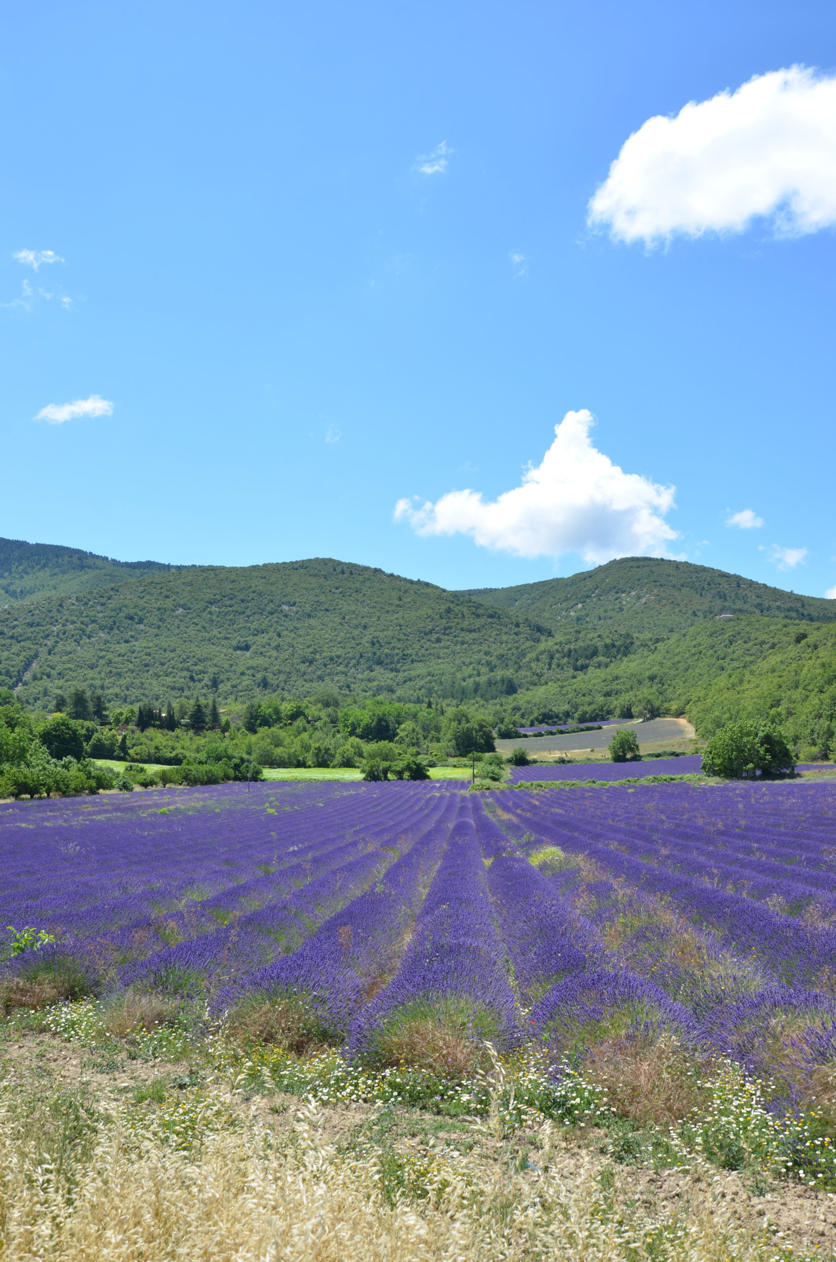 - Les champs de lavande ou de… lavandin. Eh oui, ce n’est pas de la lavande devant l’abbaye de Sénanque (ma photo précédente) mais bien du lavandin. Ce dernier est cultivé entre 200 et 800 mètres d’altitude. Il peut également se trouver en plaine. La plupart des champs de lavande que j’ai vu lors de mon séjour dans le Luberon était donc du lavandin. Honnêtement, aucune déception. C’est tout aussi joli ! Et visuellement, c’est la même chose ! Pour vous écarter de la foule et faire de belles photos, je vous conseille d’aller du côté d’Auribeau. Il n’y avait personne lorsque nous y sommes passés. Et puis, c’est là que se trouve le Mourre Nègre (le point culminant du massif du Luberon), ça devrait plaire aux amoureux de la montagne ! Nous avons profité d’être dans ce joli coin pour passer par plein de petits villages, comme Gignac, Caseneuve, Saint-Martin-de-Castillon ou encore Castelet. Nous avons ensuite rejoint Bonnieux. Et pour info, en plus des champs de lavande, nous avons aussi croisé la route de champs de blé et de tournesol.